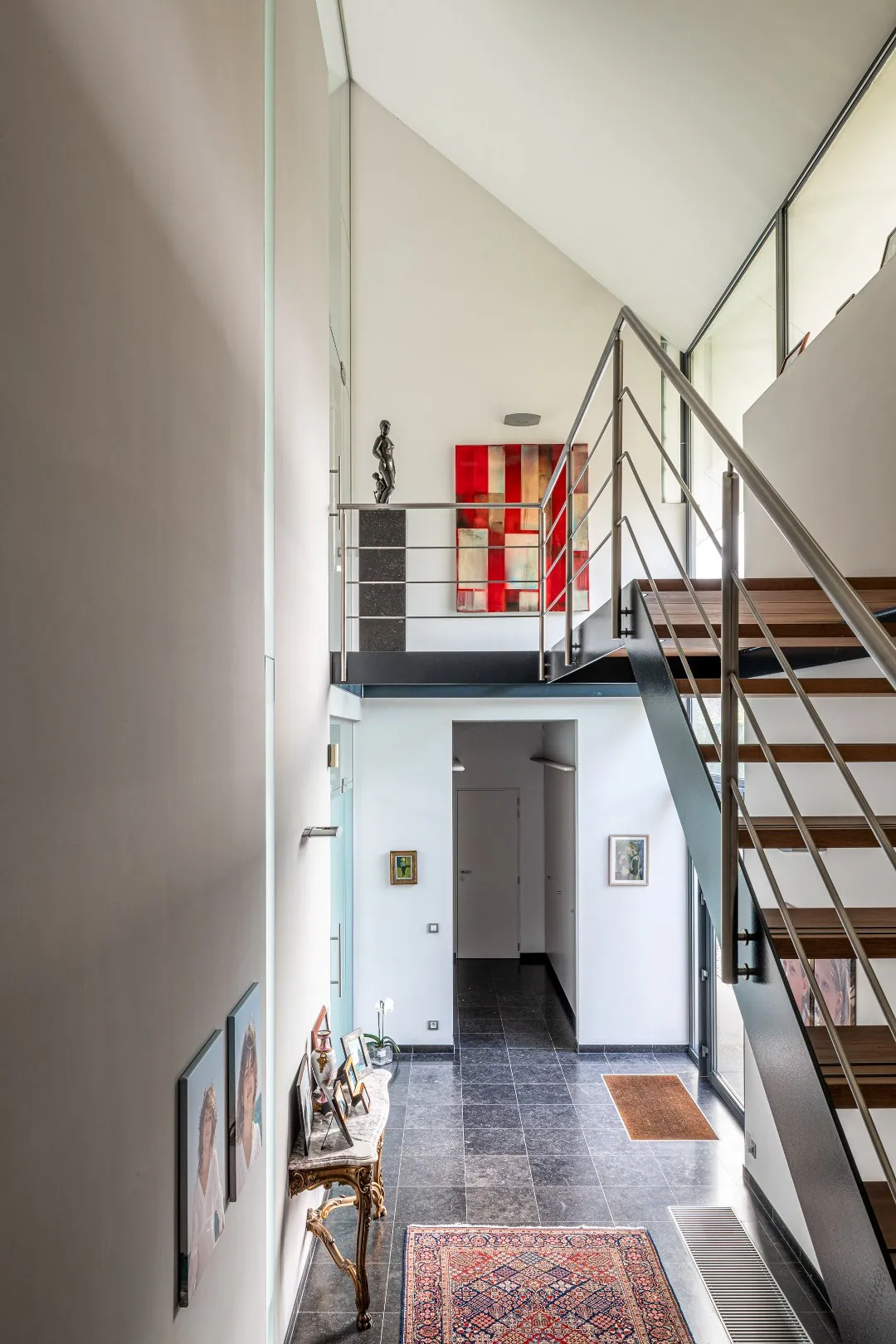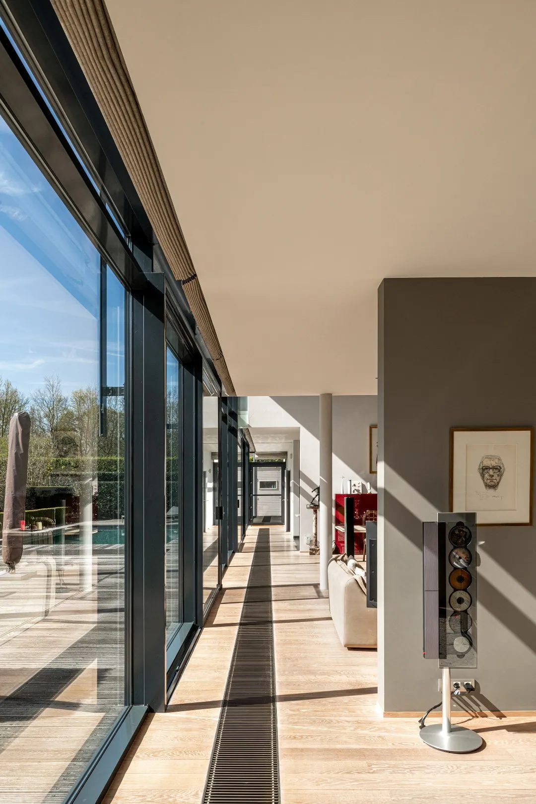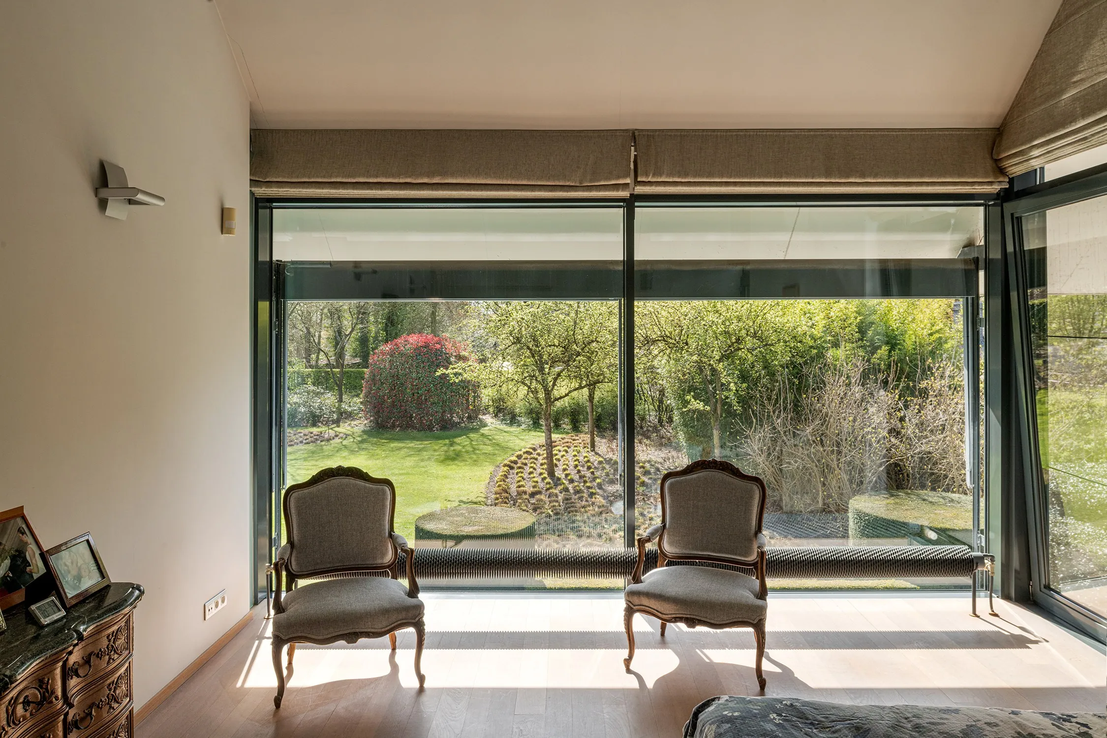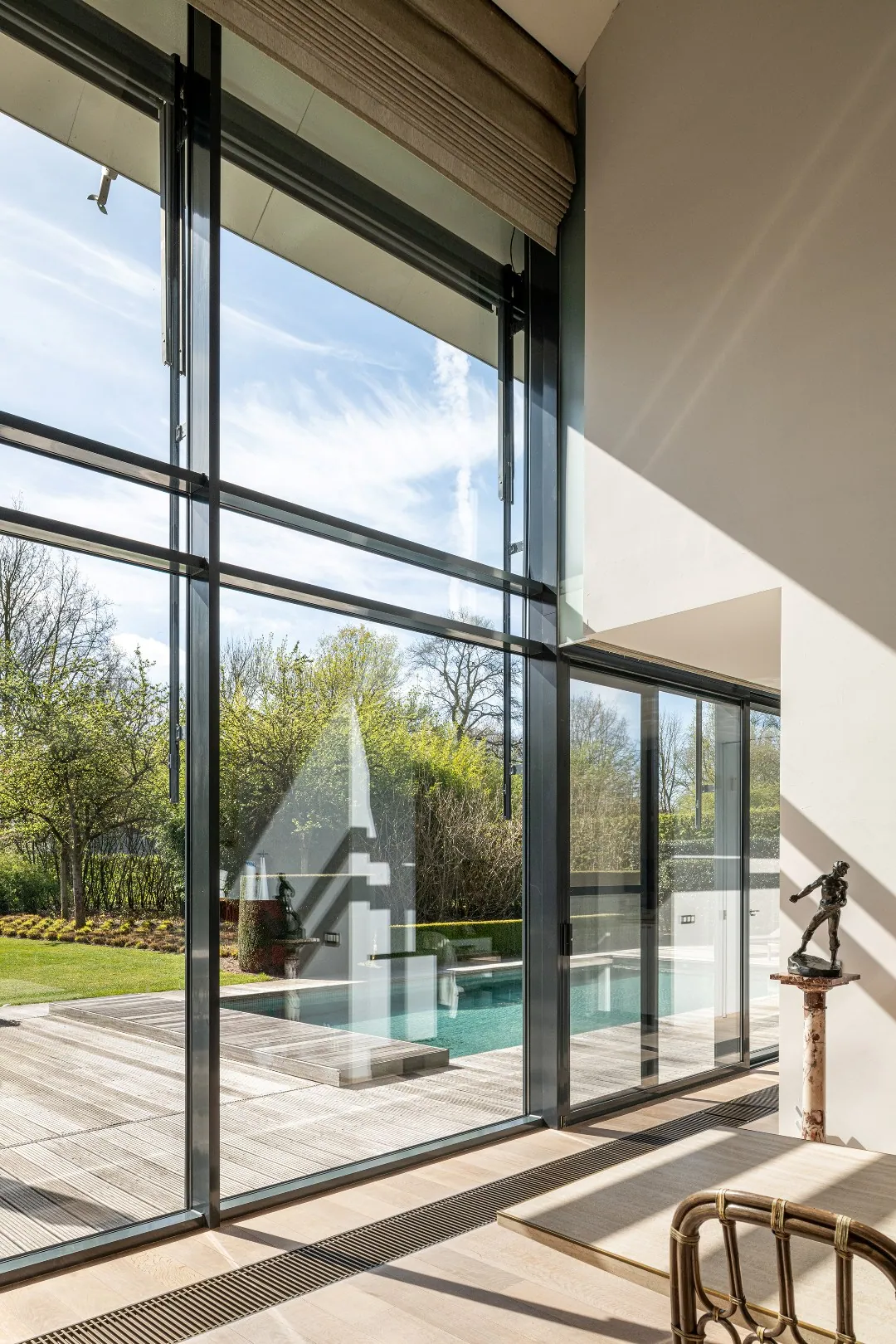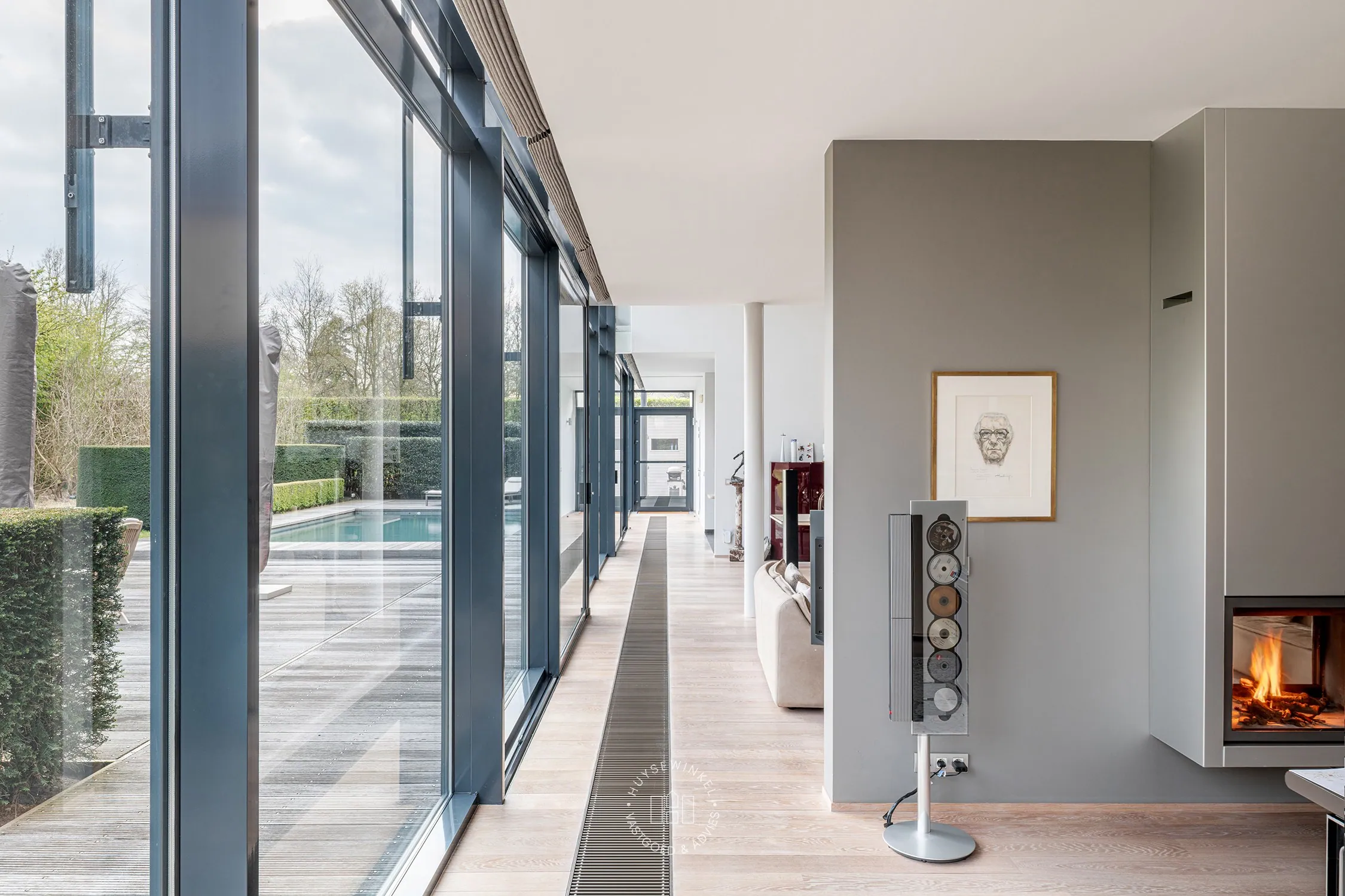 Op het gelijkvloers bevindt zich aan de zijde van de ingang een praktische garage met automatische poort. Aan de tuinzijde opent de woning zich naar een ruim terras met een geïntegreerd zwembad – een ideale plek om te ontspannen en te genieten in alle privacy. Hier vindt u tevens de ruime leefruimte en eetplaats, een bureel, de keuken, een wasplaats en een extra doucheruimte, perfect na een verfrissende duik. De verschillende leefruimtes liggen mooi naast elkaar en communiceren op een subtiele, doordachte manier, wat zorgt voor een open maar toch geborgen gevoel. Bovendien is er een lift aanwezig die u comfortabel van het gelijkvloers naar de eerste verdieping brengt, met directe toegang aan de zijde van de grote slaapkamer.