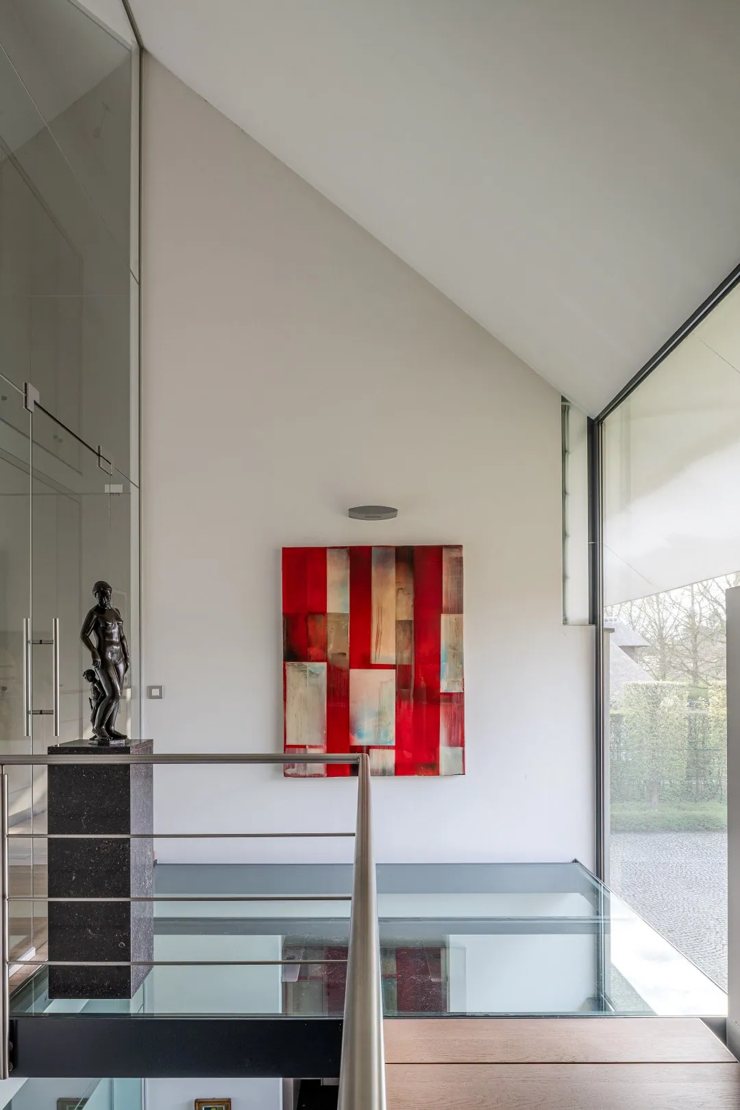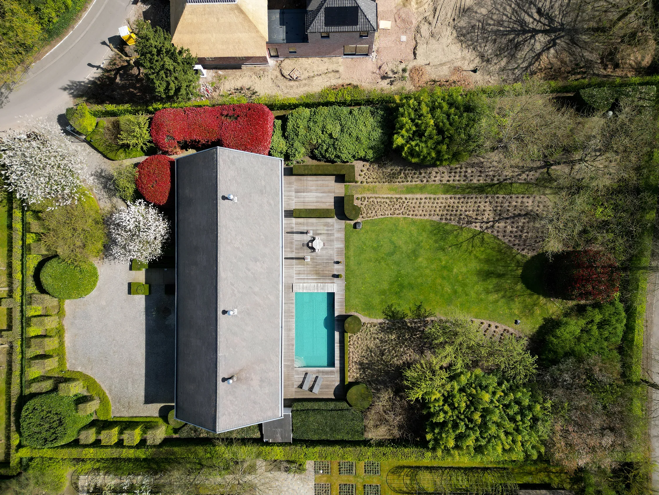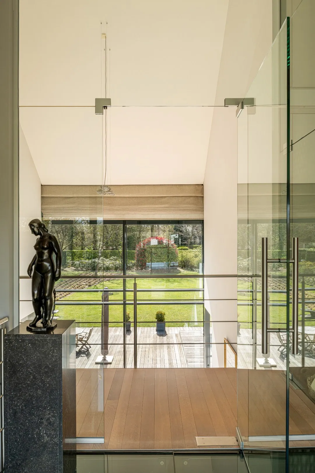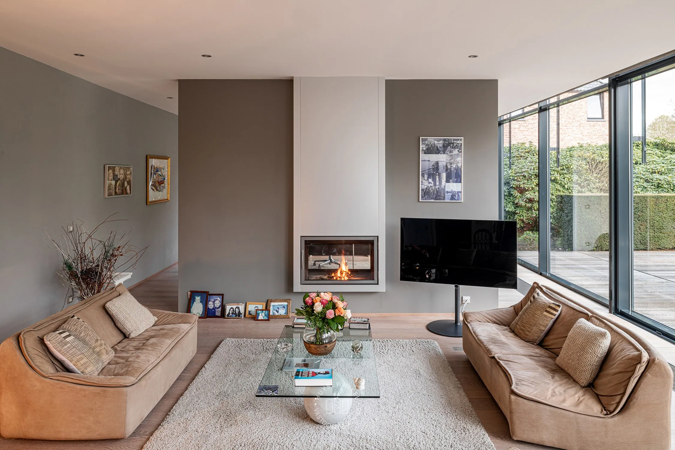 Op het gelijkvloers bevindt zich aan de zijde van de ingang een praktische garage met automatische poort. Aan de tuinzijde opent de woning zich naar een ruim terras met een geïntegreerd zwembad – een ideale plek om te ontspannen en te genieten in alle privacy. Hier vindt u tevens de ruime leefruimte en eetplaats, een bureel, de keuken, een wasplaats en een extra doucheruimte, perfect na een verfrissende duik. De verschillende leefruimtes liggen mooi naast elkaar en communiceren op een subtiele, doordachte manier, wat zorgt voor een open maar toch geborgen gevoel. Bovendien is er een lift aanwezig die u comfortabel van het gelijkvloers naar de eerste verdieping brengt, met directe toegang aan de zijde van de grote slaapkamer.