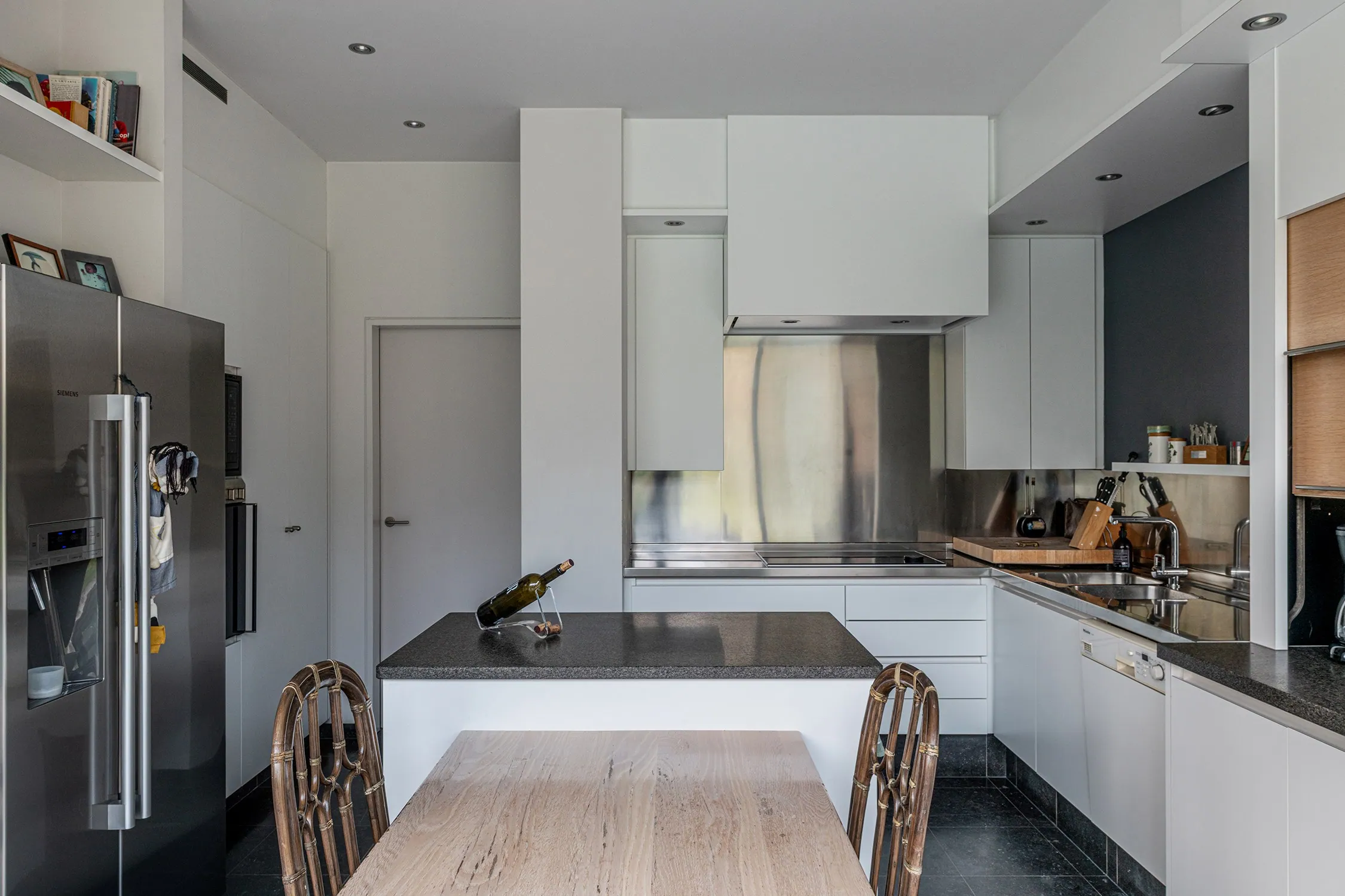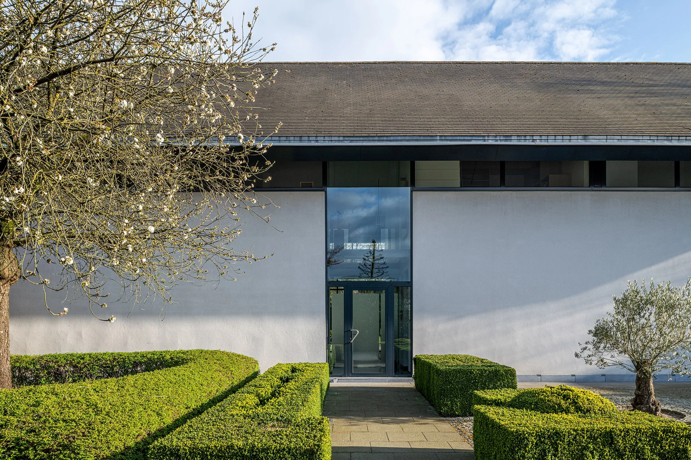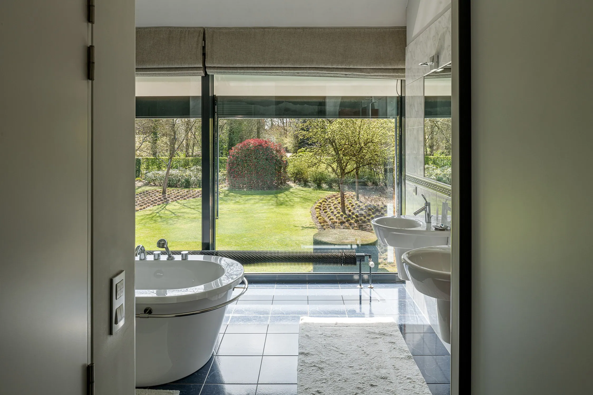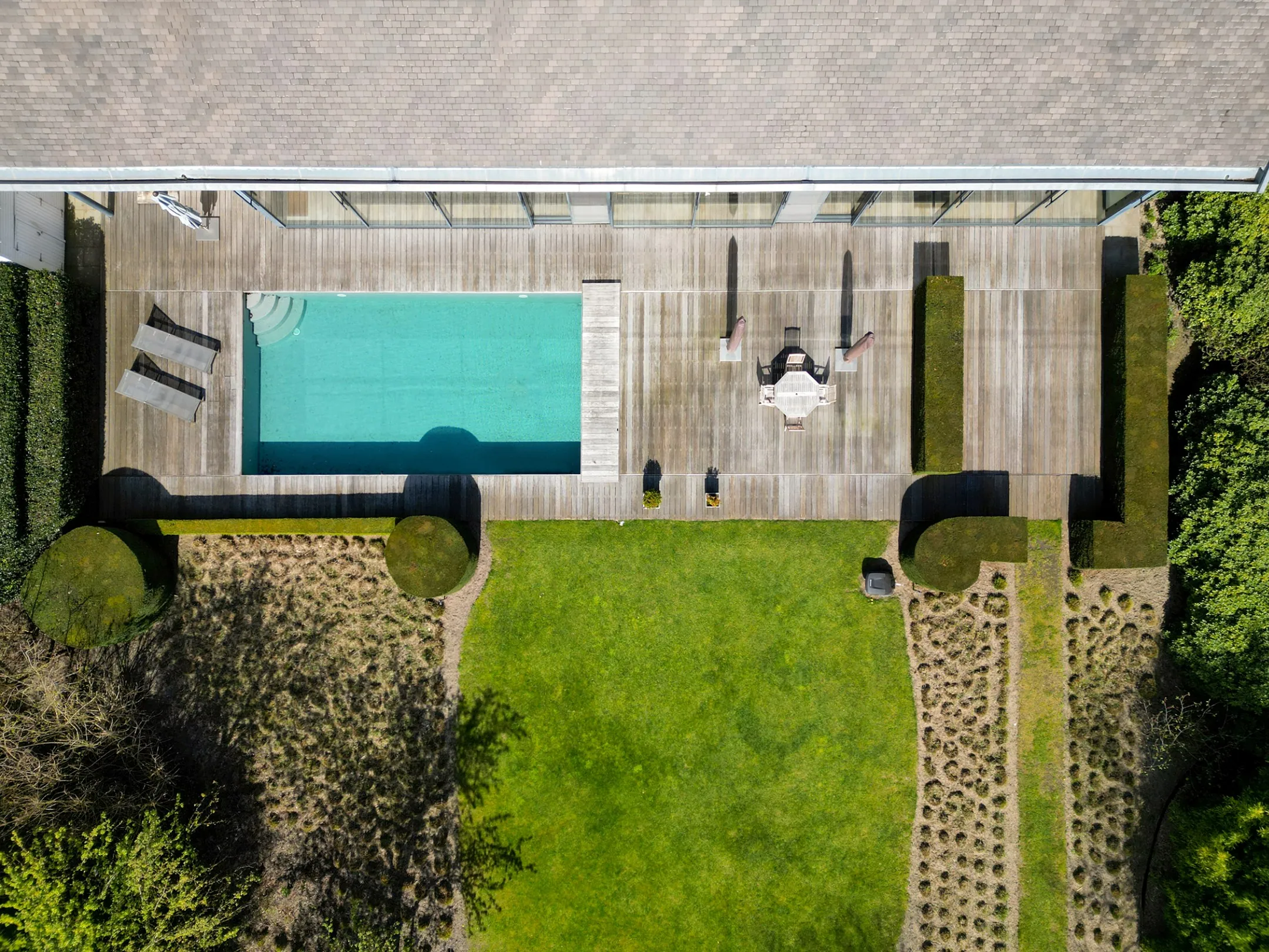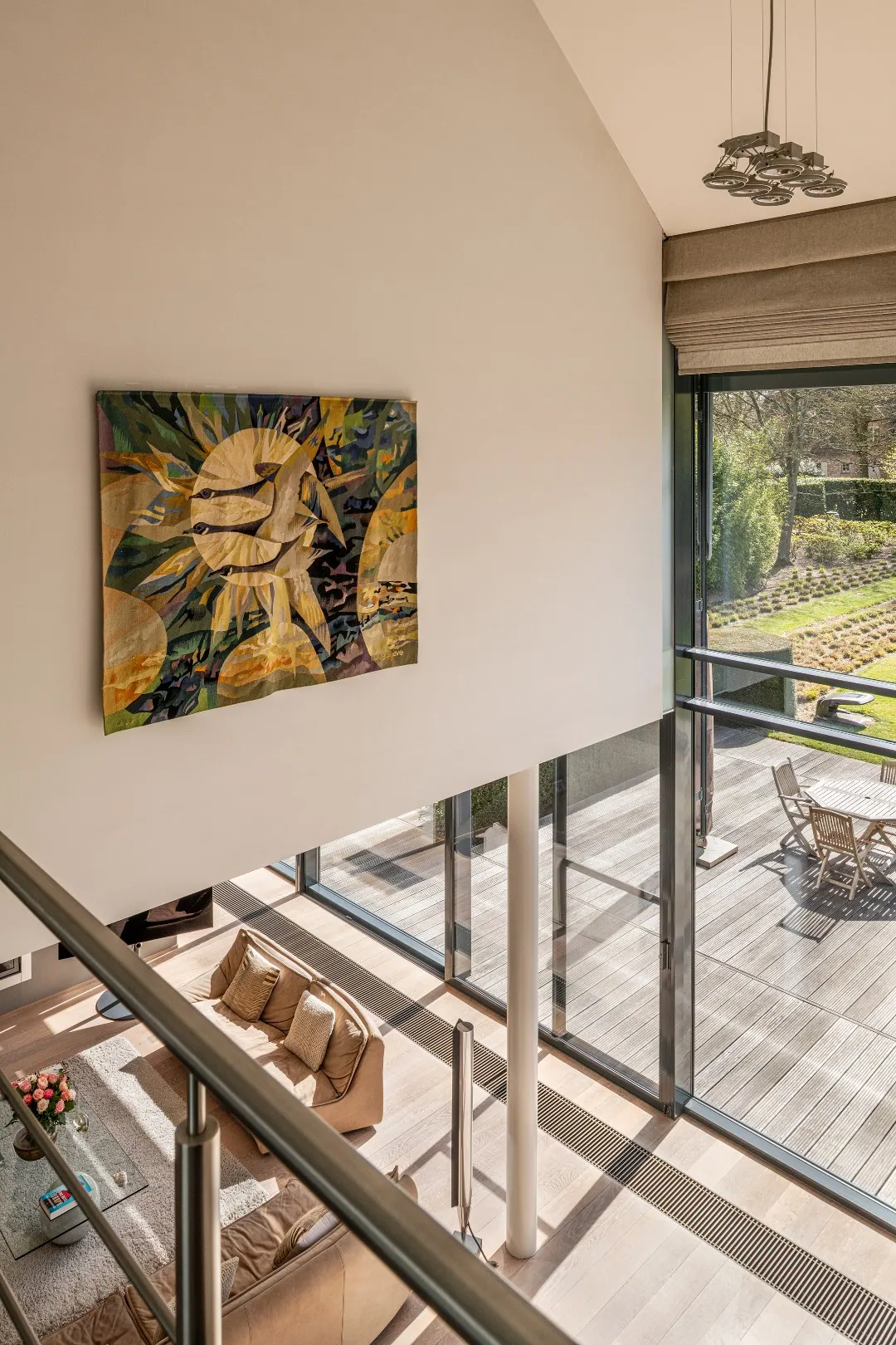Op het gelijkvloers bevindt zich aan de zijde van de ingang een praktische garage met automatische poort. Aan de tuinzijde opent de woning zich naar een ruim terras met een geïntegreerd zwembad – een ideale plek om te ontspannen en te genieten in alle privacy. Hier vindt u tevens de ruime leefruimte en eetplaats, een bureel, de keuken, een wasplaats en een extra doucheruimte, perfect na een verfrissende duik. De verschillende leefruimtes liggen mooi naast elkaar en communiceren op een subtiele, doordachte manier, wat zorgt voor een open maar toch geborgen gevoel. Bovendien is er een lift aanwezig die u comfortabel van het gelijkvloers naar de eerste verdieping brengt, met directe toegang aan de zijde van de grote slaapkamer.